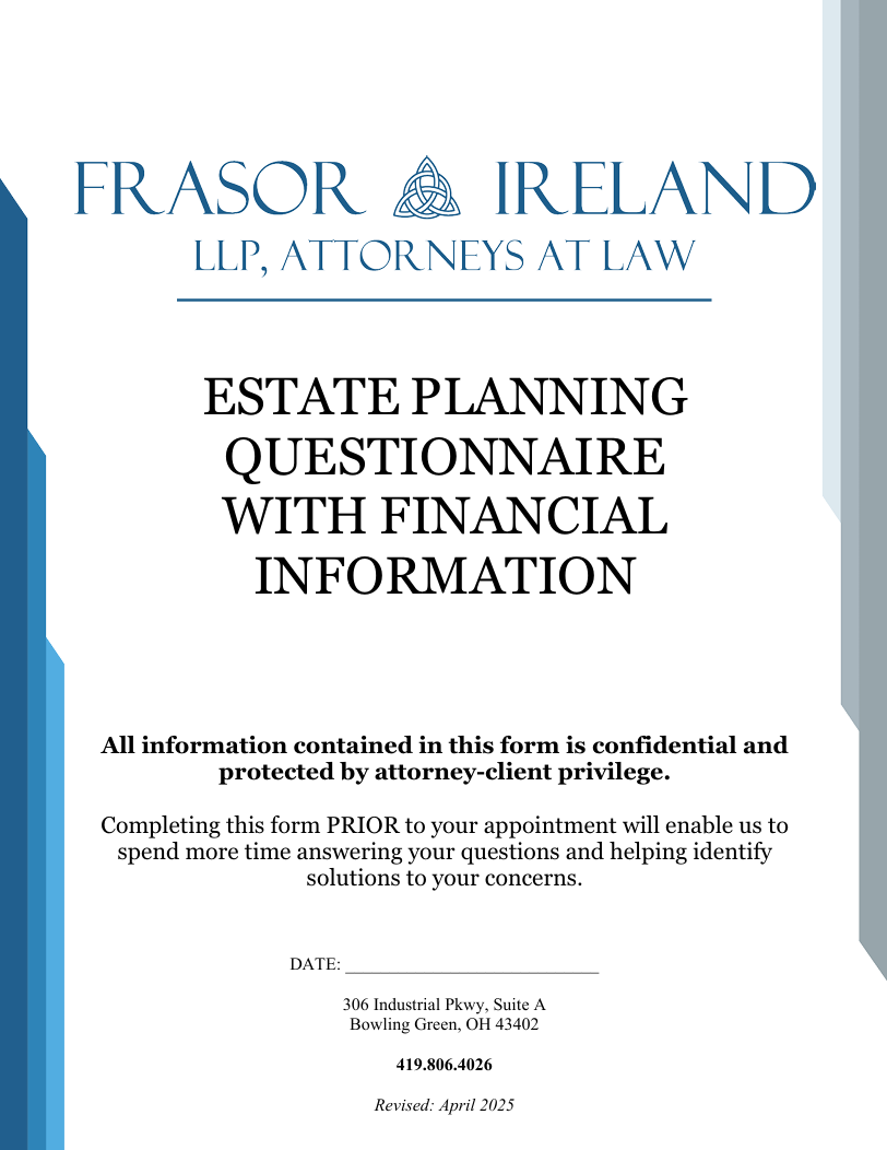 Estate planning ensures your wishes are honored and loved ones are protected. Our comprehensive Estate Planning Questionnaire should serve as a helpful starting point for anyone looking to be prepared. Completing this questionnaire before your appointment with us will enable us to spend more time answering your questions and help you identify solutions to your concerns! If you need guidance, Frasor Ireland LLP is here to help!